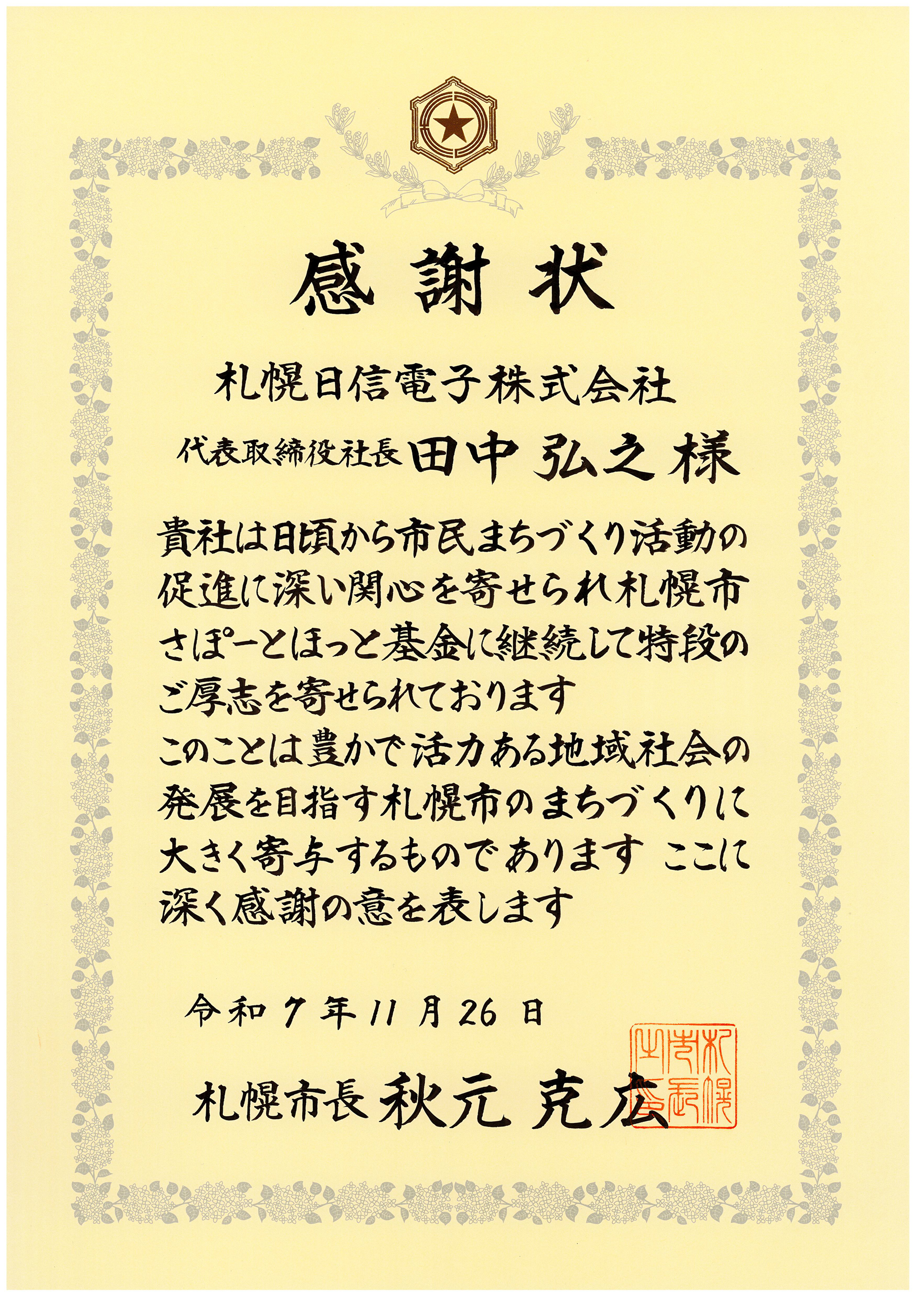 札幌市絵本基金「子ども未来文庫」感謝状を拝受しました(2024.12.12)