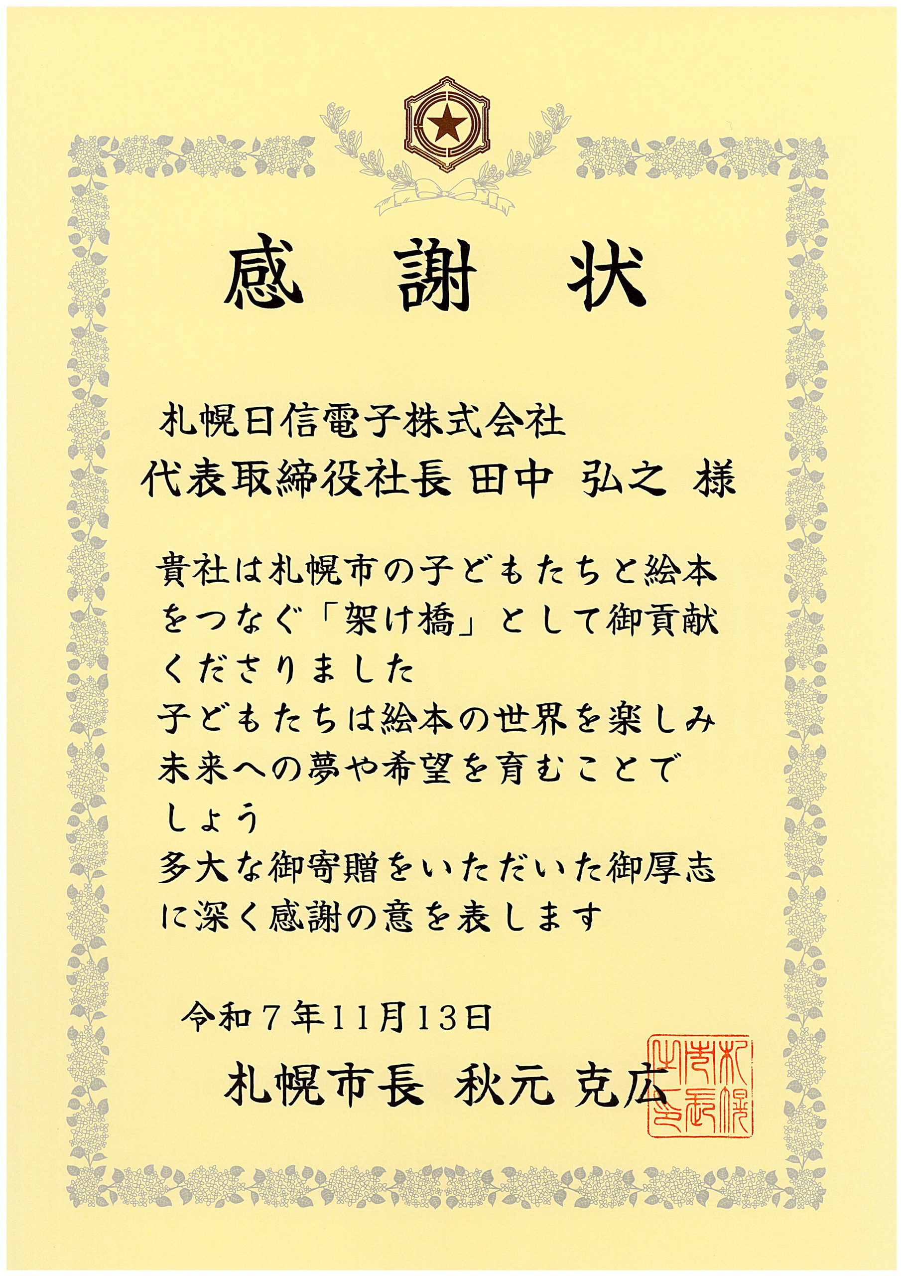 札幌市絵本基金「子ども未来文庫」感謝状を拝受しました(2025.11.19)